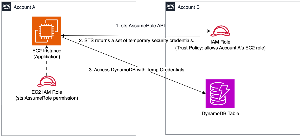 EC2 instance assumes Account B's role để temporary access DynamoDB