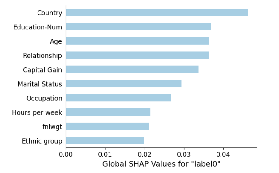 Ví dụ: Sử dụng kĩ thuật SHAP trong Sagemaker, những feature có giá trị SHAP càng cao, càng ảnh hưởng lớn đến kết quả dự đoán của mô hình ( feature Country đang có giá trị SHAP lớn nhất -> feature này ảnh hưởng cao nhất đến kết quả dự đoán mô hình, ngược lại feature Ethnic group có giá trị SHAP nhỏ nhất -> feature ảnh hưởng thấp nhất đến kết quả dự đoán mô hình ):