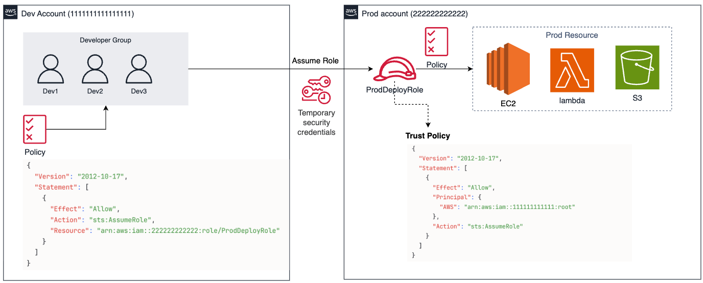 Developers trong Development account không thể sử dụng policy của Production account để access resources. Cần có assume role mechanism để establish cross-account trust.